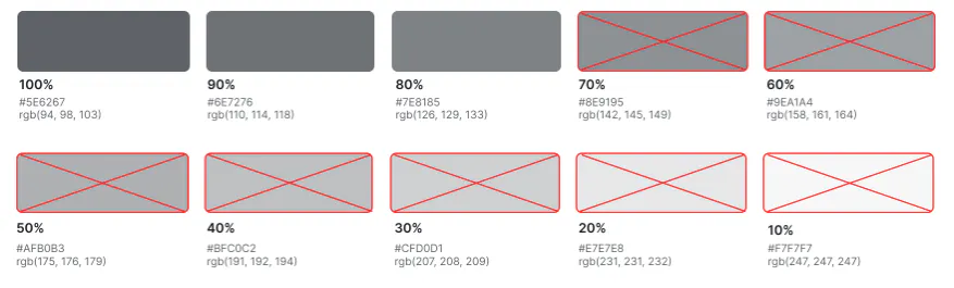 Na Embracon a paleta Tons de cinza é usada para aplicação em texto e pode ser utilizada em elementos de apoio visual que organizam e mantém a hierarquia da interface (dividers, linhas de tabela, background e strokes).